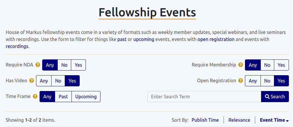Our main search page has been improved with controls to filter content based on whether it requires the user to have completed their NDA or is an active member. The events page has its new search with those controls as well as additional ones for whether events have videos, open registration, and whether they are past or upcoming events.
